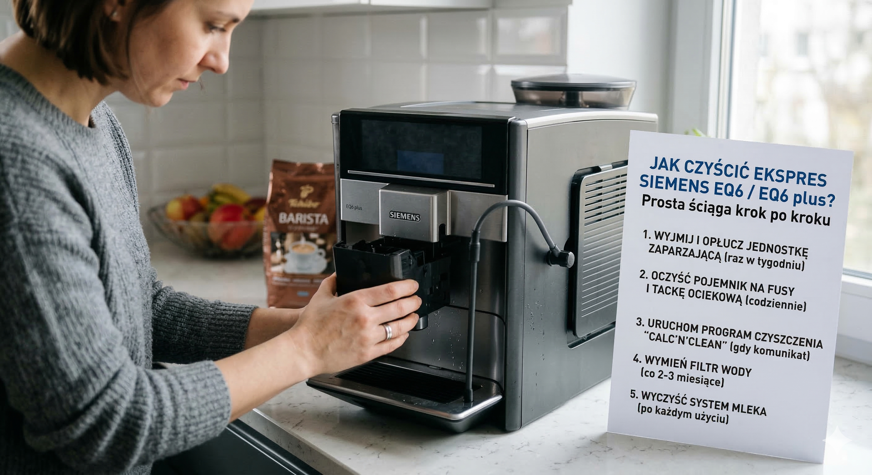 Dobra wiadomość jest prosta: nie trzeba za każdym razem przekopywać instrukcji. Cała pielęgnacja sprowadza się do czterech rzeczy: codziennego czyszczenia, dbania o system mleka, mycia bloku zaparzającego oraz uruchamiania programów serwisowych: Czyszczenie, Odkamienianie i Calc’nClean. Gdy na wyświetlaczu pojawi się odpowiedni komunikat, Siemens zaleca wykonać program od razu.