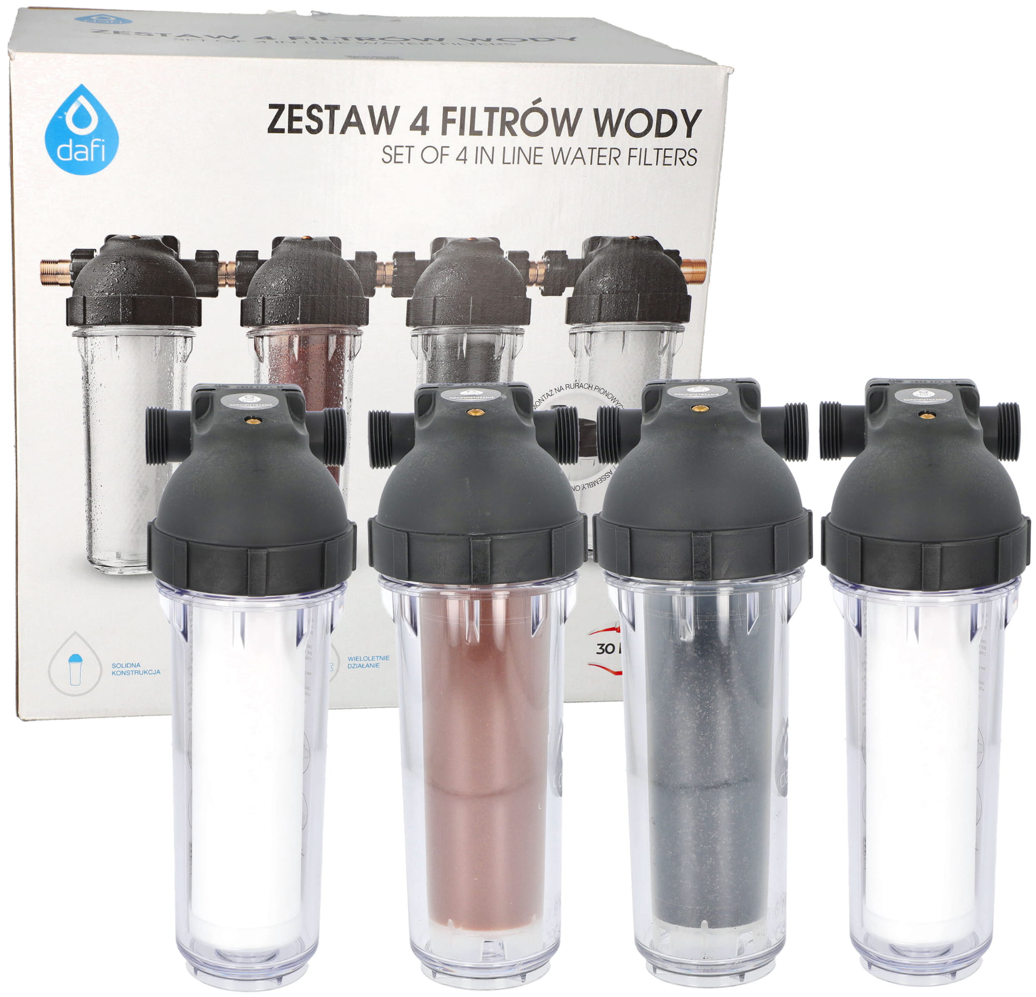 Zestaw Dafi obudowy filtra z wkładem węglowym, żywicznym oraz 2 szt. wkładu polipropylenowego + złączki