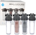 Zestaw składa się z: filtr polipropylenowy: 2 sztuki, filtr węglowy: 1 sztuka, filtr żywiczny: 1 sztuka, obudowy filtra: 4 sztuki, klucz montażowy: 1 sztuka, śrubunek: 1 komplet, złączka do obudowy filtra: 3 sztuki, uszczelki: 8 sztuk oraz instrukcja obsługi i montażu.