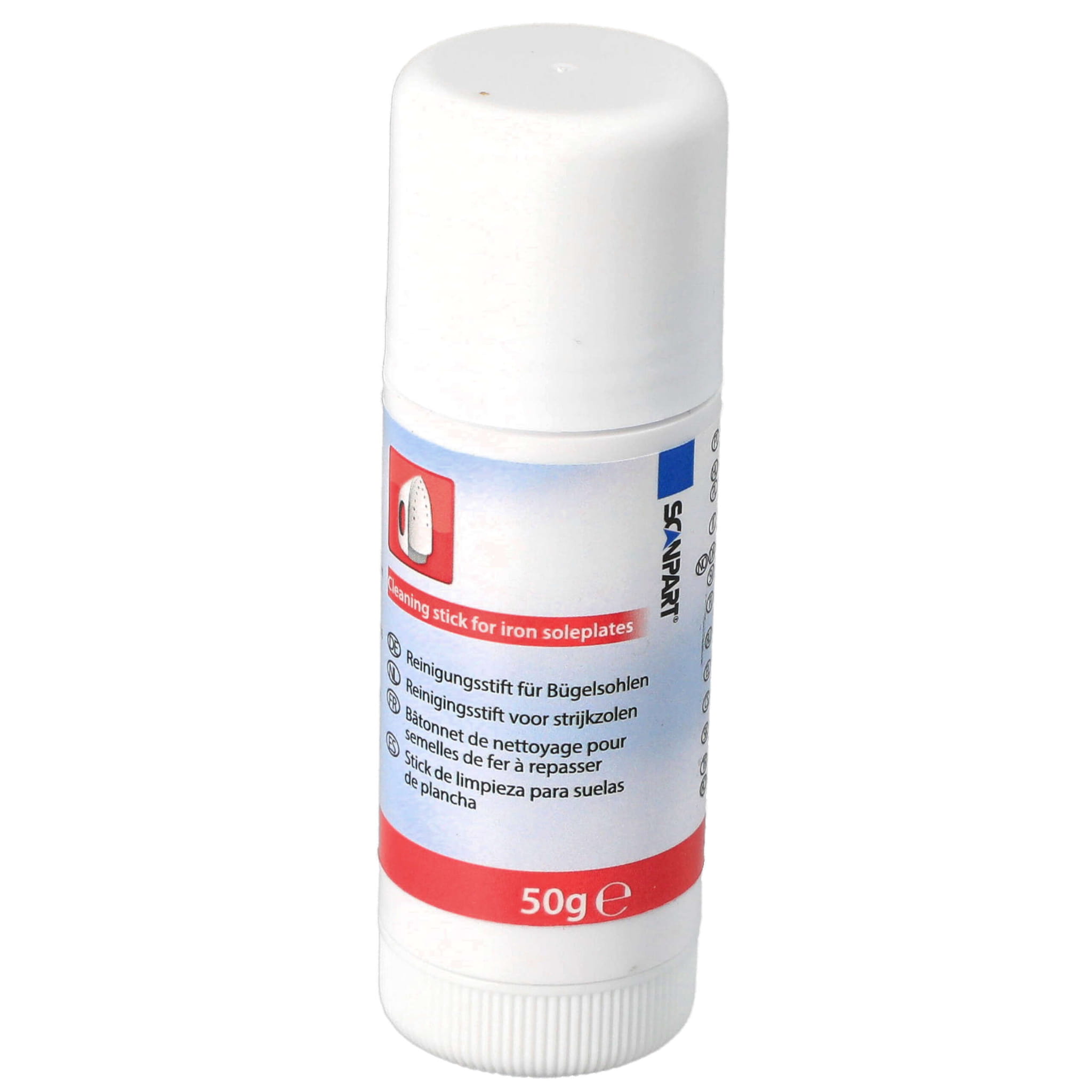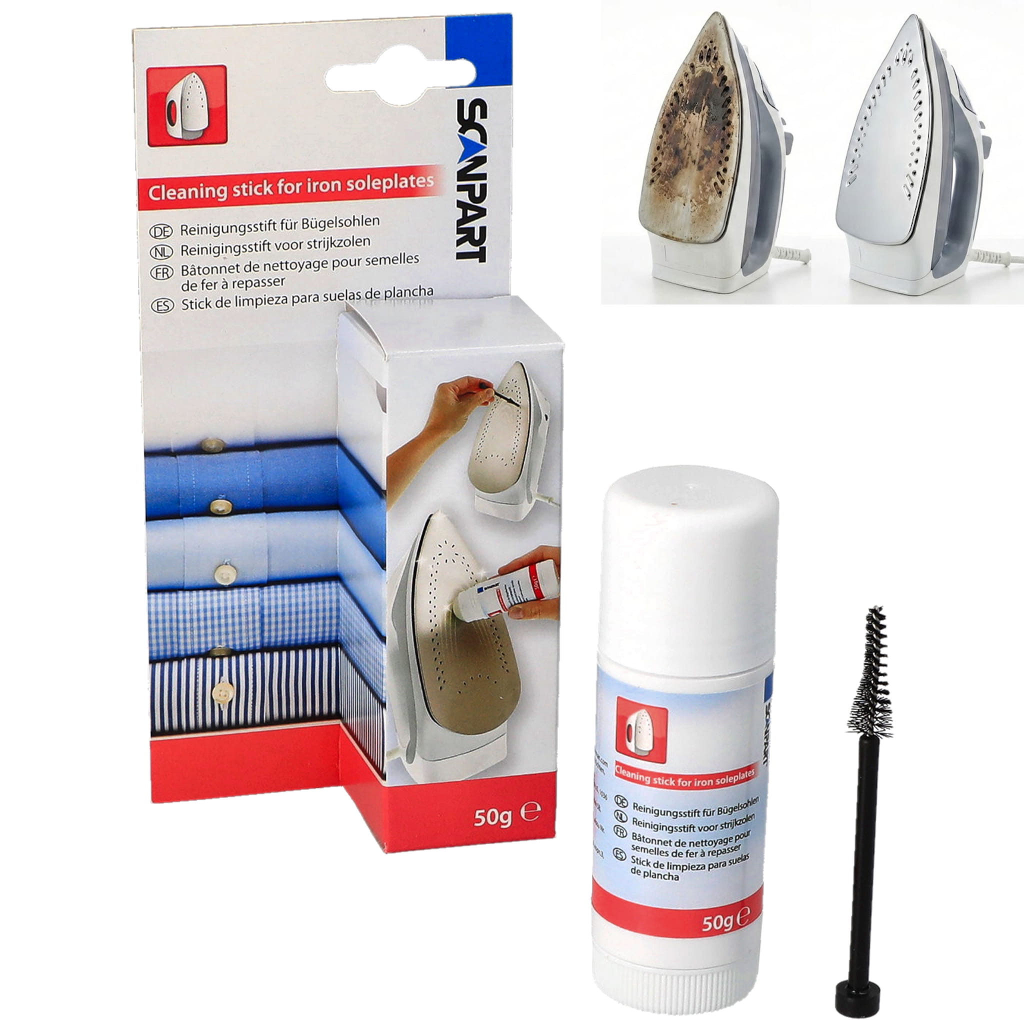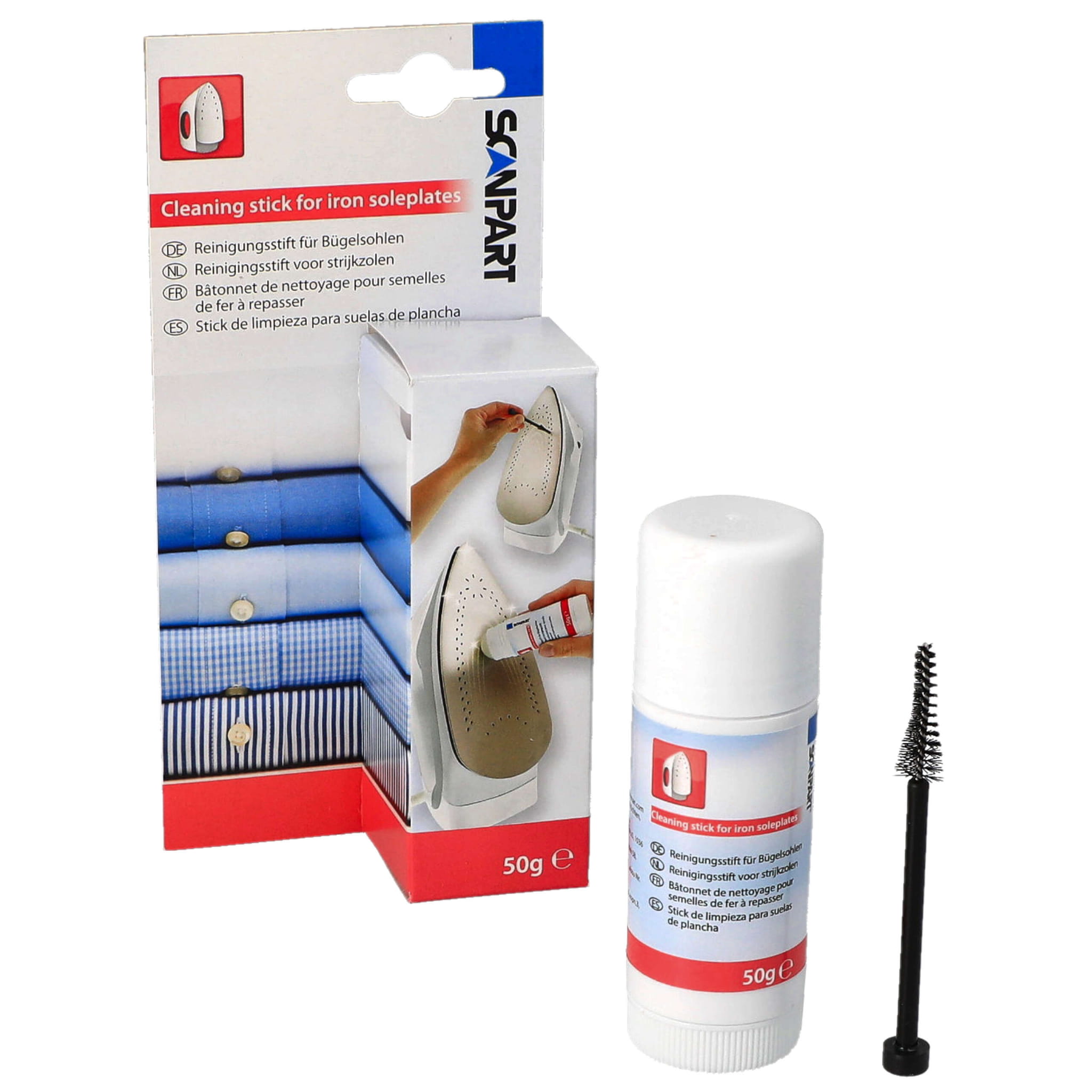 Przypalenia na stopie żelazka, czarne smugi na tkaninach i „szarpanie” po materiale? Ten sztyft czyszczący Scanpart pomaga szybko usunąć osad i zabrudzenia ze stopy żelazka. W zestawie dostajesz też szczoteczkę, która ułatwia oczyszczenie otworów pary i miejsc, do których trudno dotrzeć samą ściereczką.